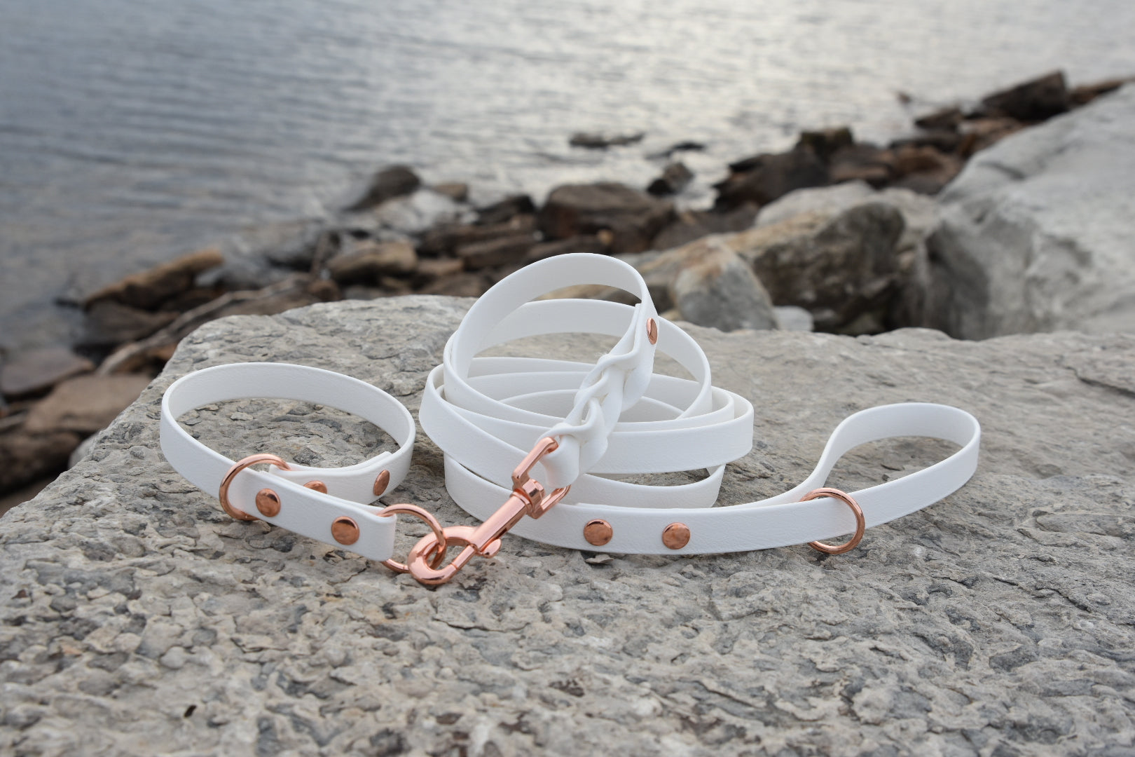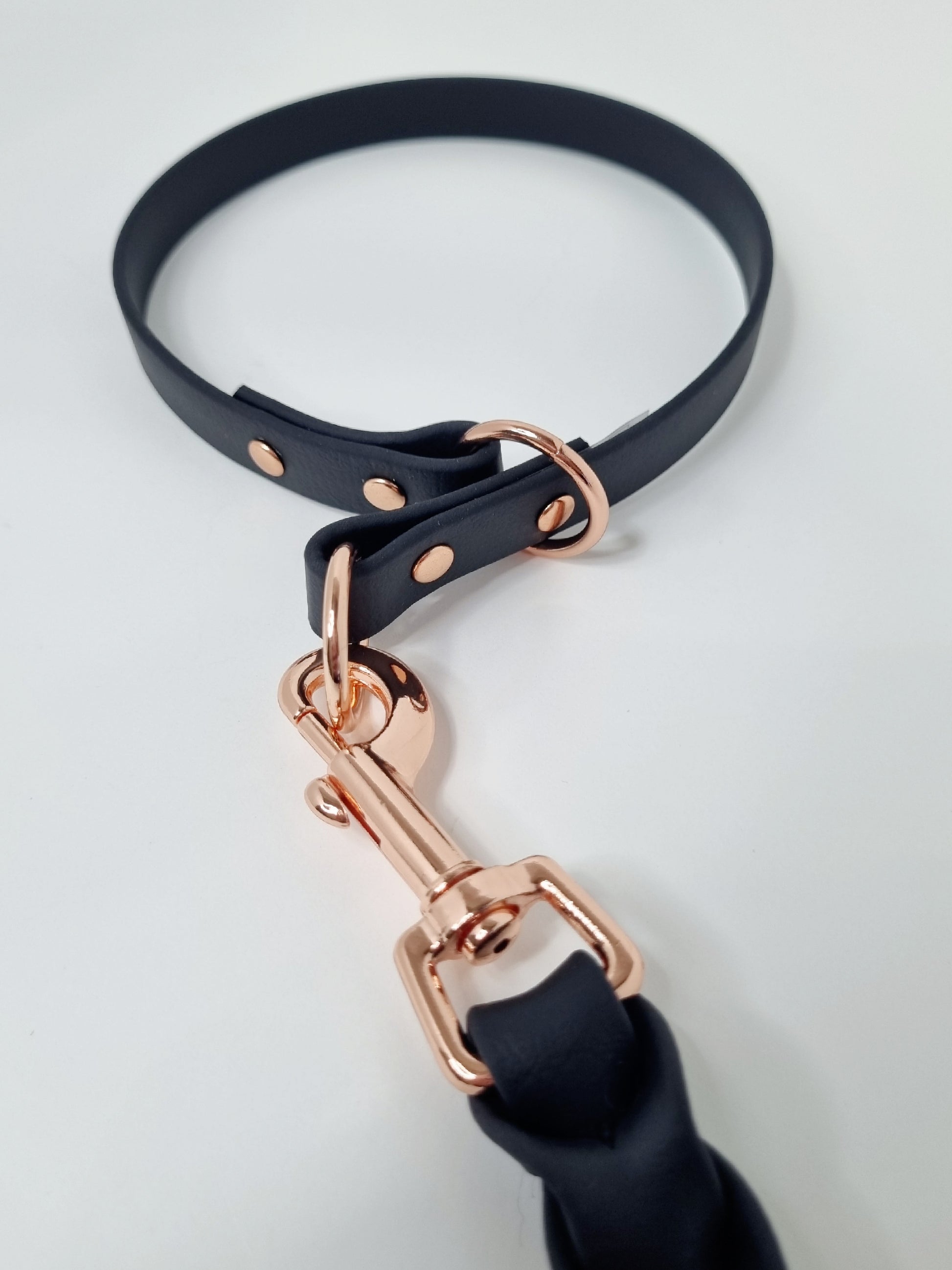 Elite is handmade to your specific measures from 5/8 inch wide BioThane and it has welded rose gold o-rings. BioThane is very strong, US-made material that looks and feels like real leather but is 100% vegan and it´s latex free. This material is very durable and it feels soft to your dogs neck. It is a breeze to keep clean!